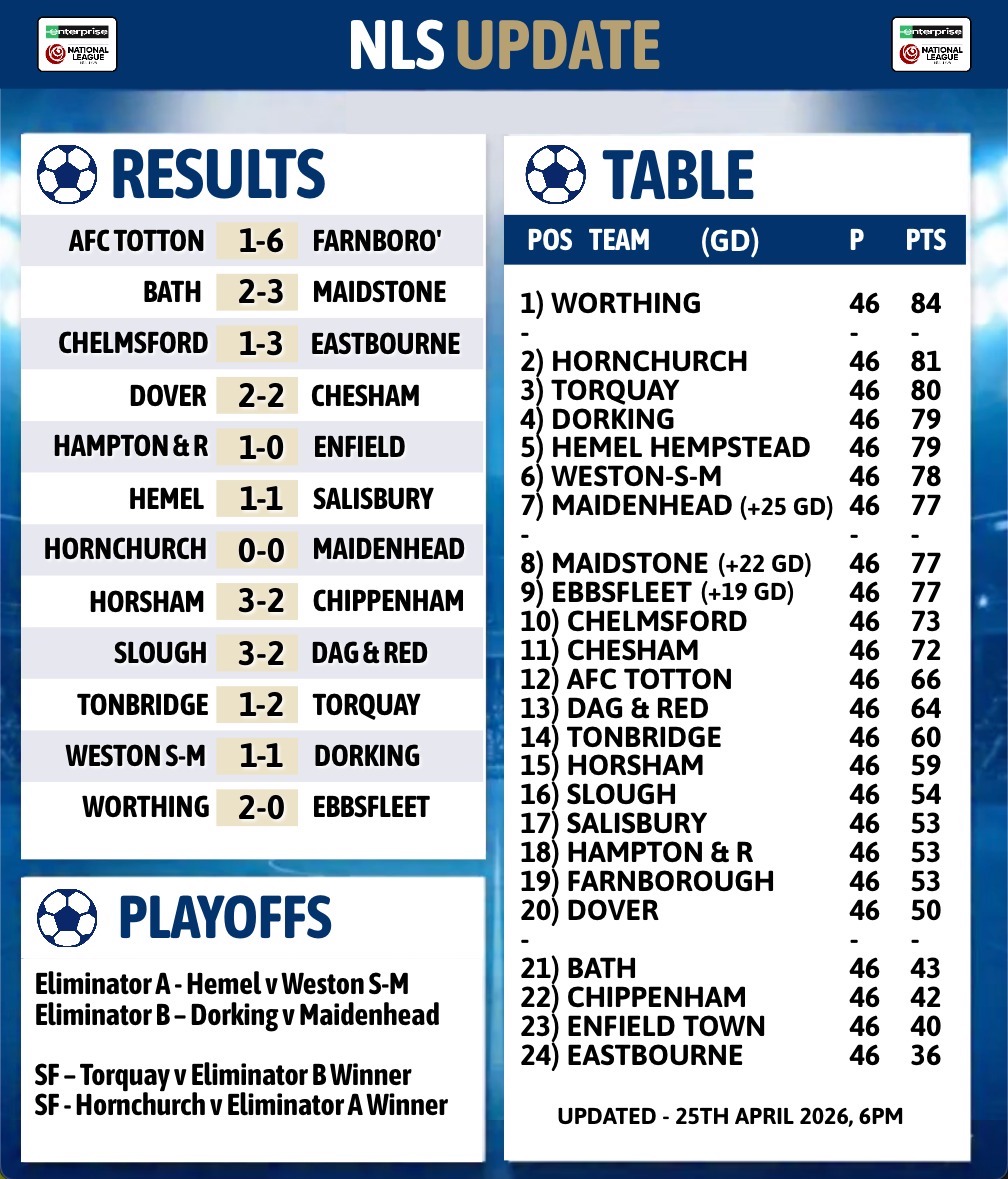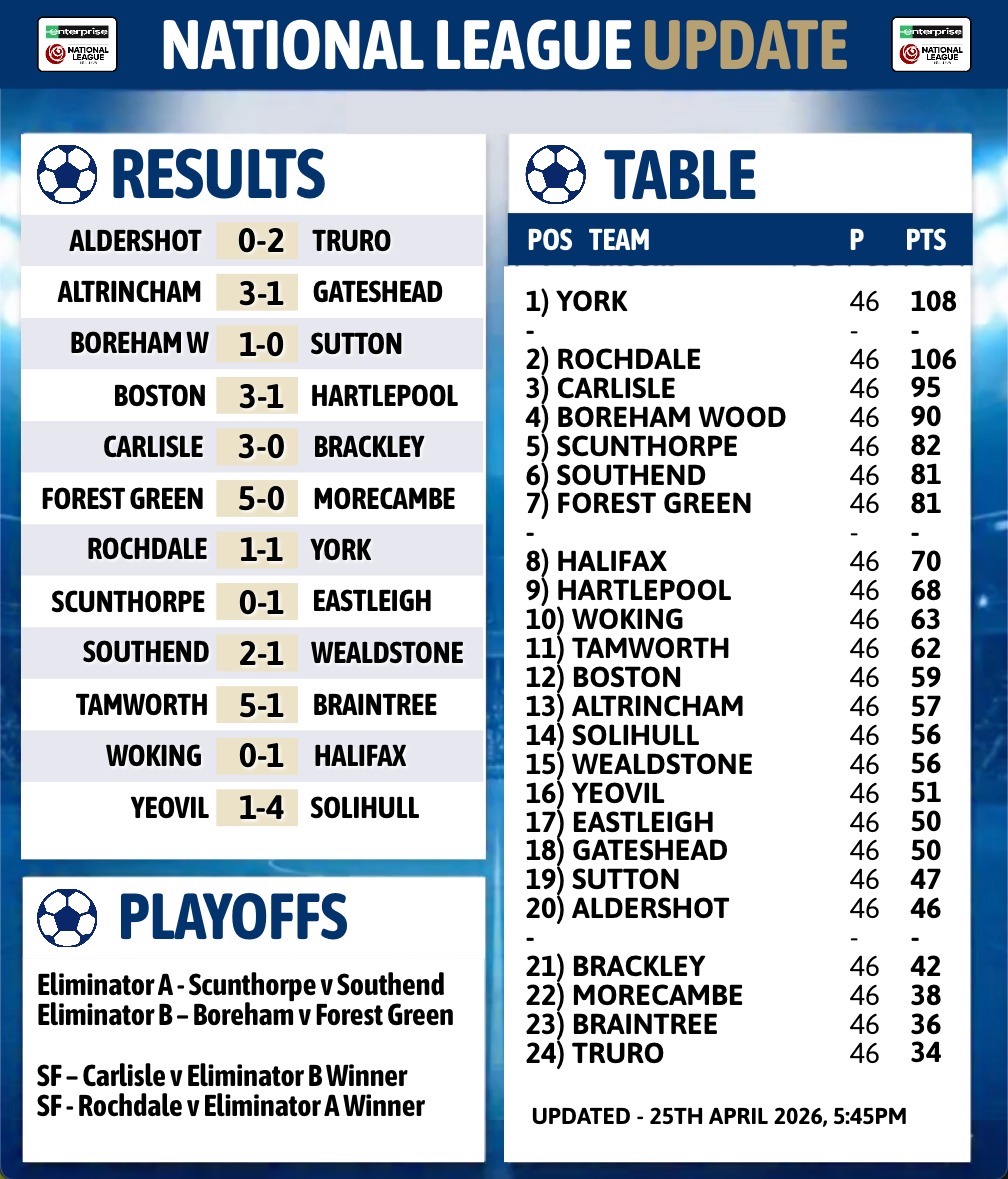 We look at the 2025/26 National League, North, South title winners, playoffs and relegations confirmed now the regular season is over.