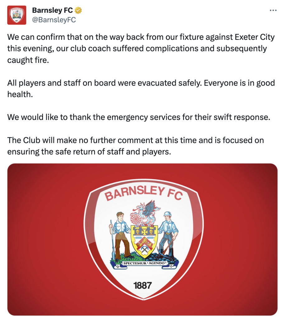 Barnsley Football Club can confirm that on the way back from our fixture against Exeter City this evening, our club coach suffered complications and subsequently caught fire.