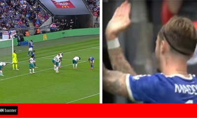 Viewers watching on TV at home and fans from the stands spot what James Maddison did with a pitch invader during...