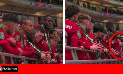 Liverpool warn Kostas Tsimikas after disgusted fans spot him spitting gum into the stand below him while lifting the Carabao Cup...