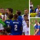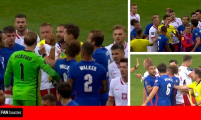 Heated scenes played out on the pitch as Poland and England players come to blows after the half time whistle blew...