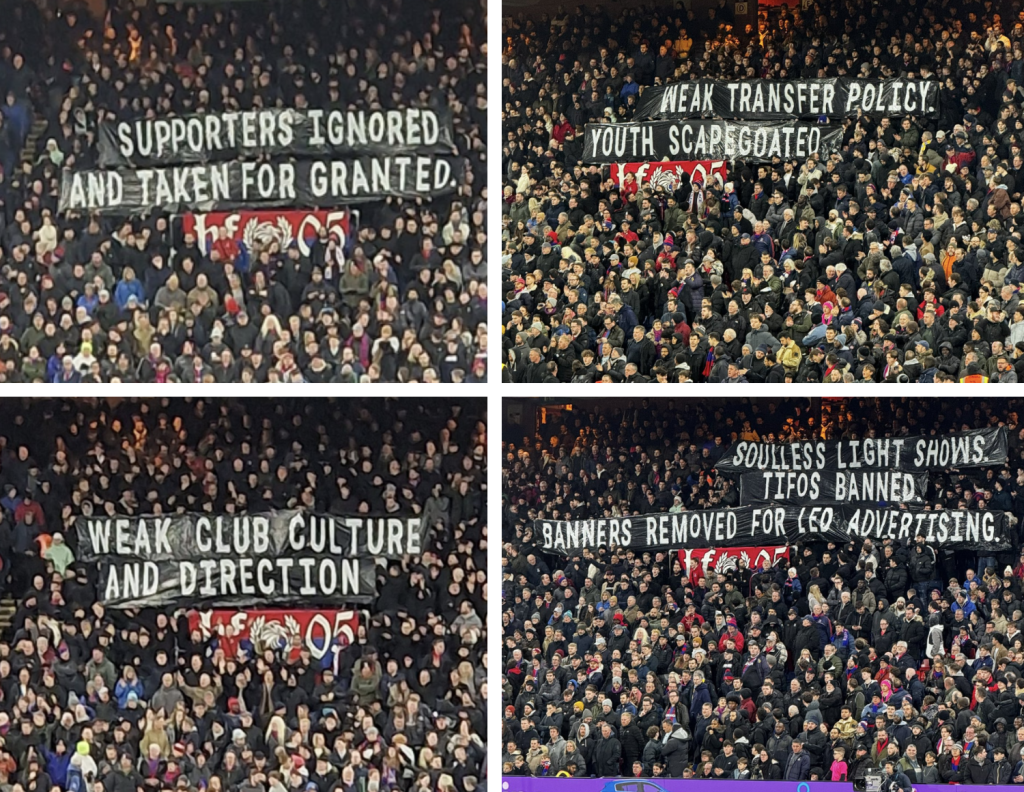 Twitter users reacted after Crystal Palace fans display more banners as Roy Hodgson tells supporters to be ‘realistic’…