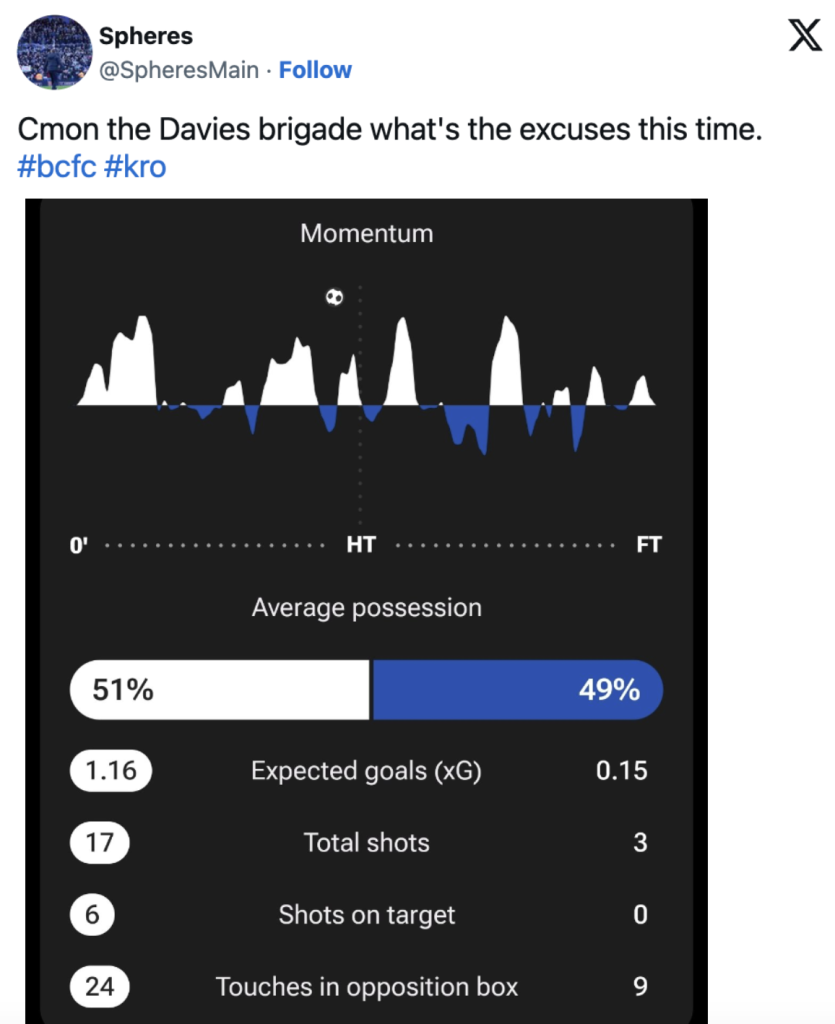 Sorry “Happy Clappers”, but that was utter shite. And that’s being kind. Embarrassing, gutless shit. Pack your bag Davies, you haven’t got a clue how to get the best out of these players. Your selection, subs were bizarre. Just leave. #BCFC #KRO pic.twitter.com/Wxoz78EUIO
