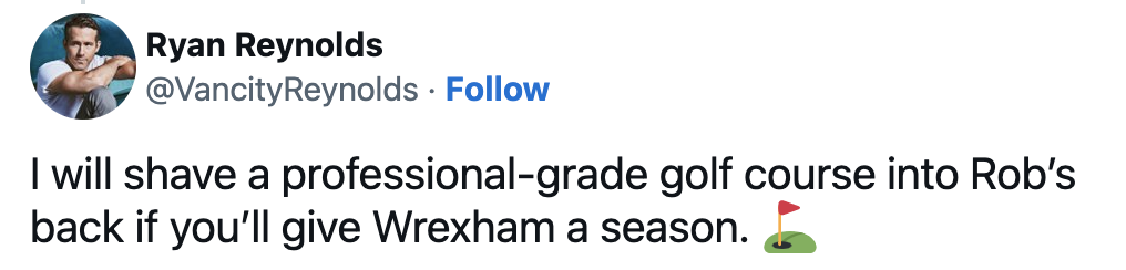 This caught the attention of Ryan Reynolds on Wednesday morning, tweeting: “I will shave a professional-grade golf course into Rob’s back if you’ll give Wrexham a season. ⛳️