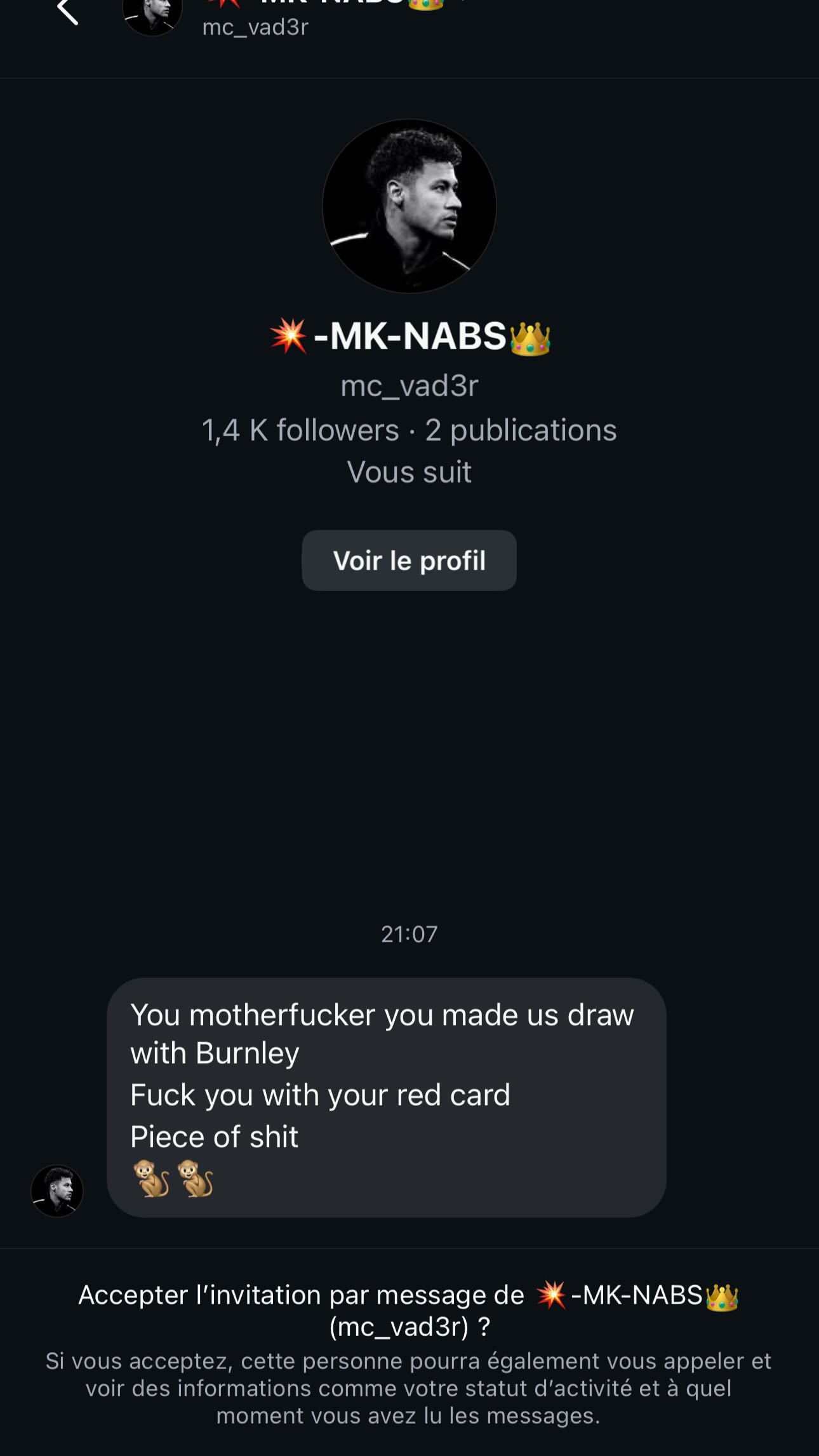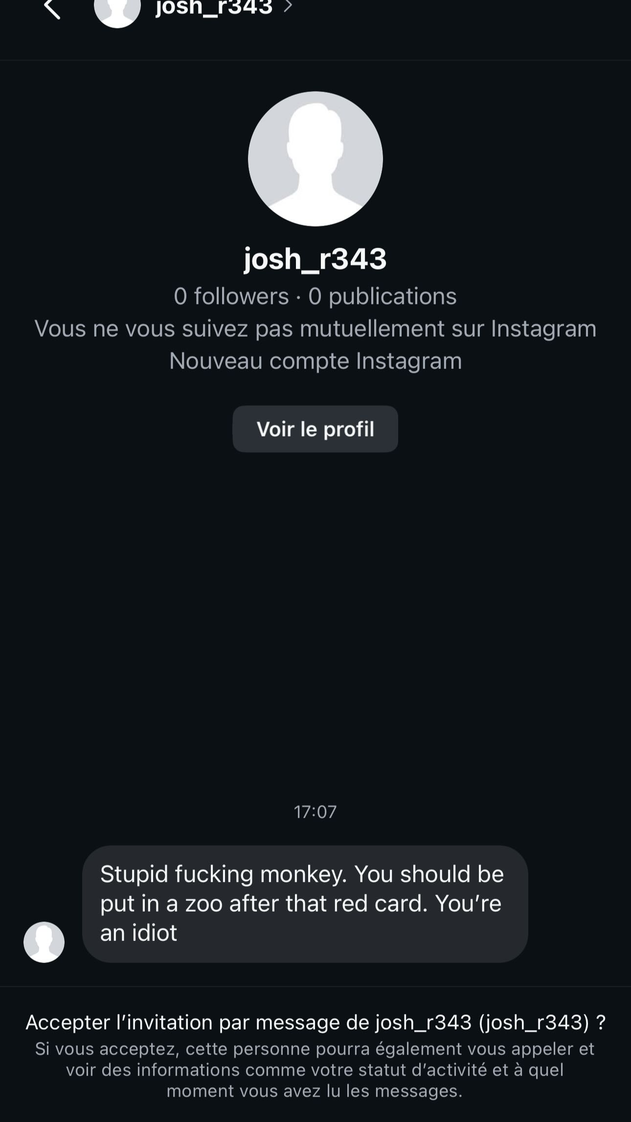 Fofana, who was sent off after receiving a second yellow card, posted several screenshots of private messages he received on Instagram following the game.