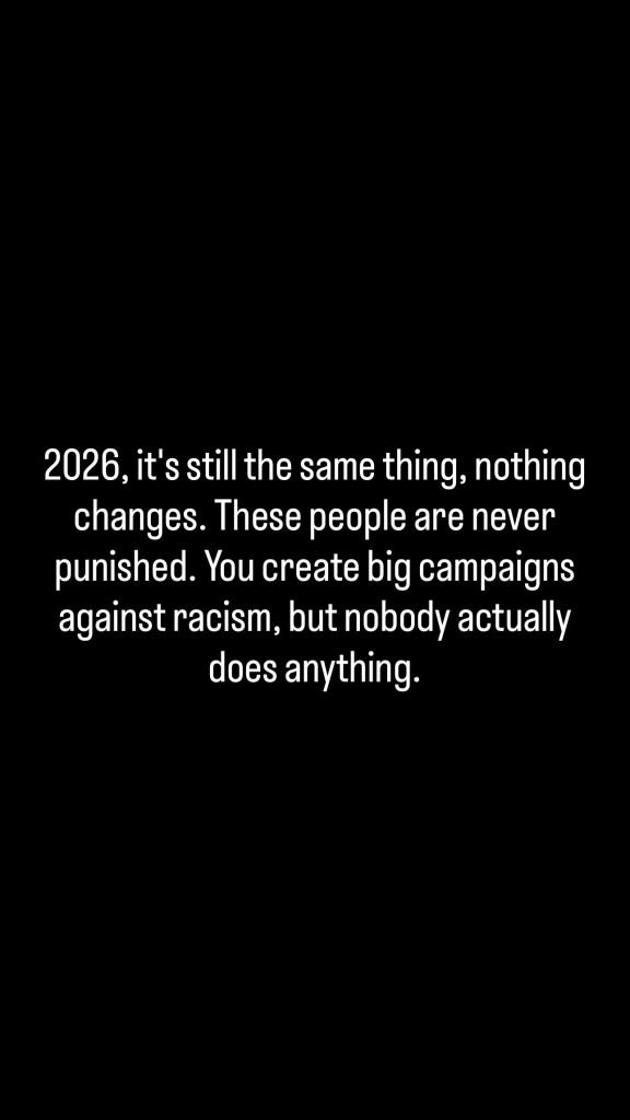 He said: “2026, it’s still the same thing, nothing changes. These people are never punished. You create big campaigns against racism, but nobody actually does anything.”