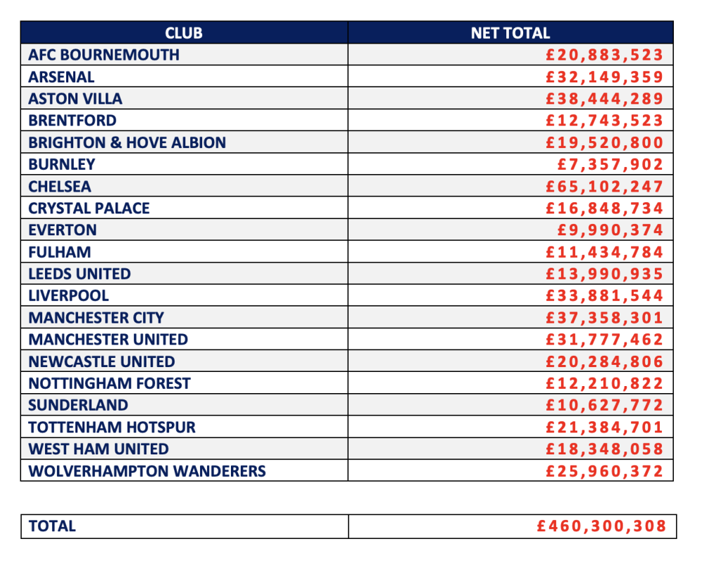 CLUB – NET TOTAL AFC BOURNEMOUTH – £20,883,523 ARSENAL – £32,149,359 ASTON VILLA – £38,444,289 BRENTFORD – £12,743,523 BRIGHTON & HOVE ALBION – £19,520,800 BURNLEY – £7,357,902 CHELSEA – £65,102,247 CRYSTAL PALACE – £16,848,734 EVERTON – £9,990,374 FULHAM – £11,434,784 LEEDS UNITED – £13,990,935 LIVERPOOL – £33,881,544 MANCHESTER CITY – £37,358,301 MANCHESTER UNITED – £31,777,462 NEWCASTLE UNITED – £20,284,806 NOTTINGHAM FOREST – £12,210,822 SUNDERLAND – £10,627,772 TOTTENHAM HOTSPUR – £21,384,701 WEST HAM UNITED – £18,348,058 WOLVERHAMPTON WANDERERS – £25,960,372 TOTAL – £460,300,308
