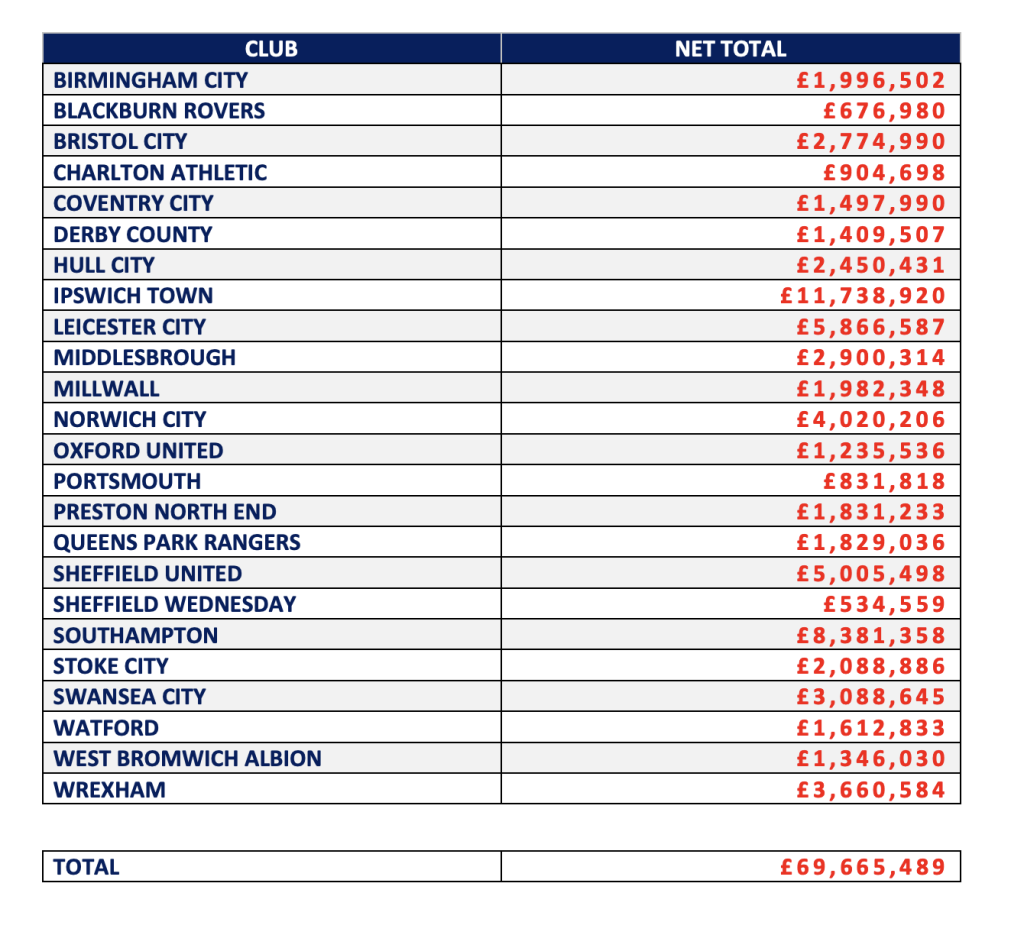 CLUB – NET TOTAL BIRMINGHAM CITY – £ 1,996,502 BLACKBURN ROVERS – £676,980 BRISTOL CITY – £2,774,990 CHARLTON ATHLETIC – £904,698 COVENTRY CITY – £1,497,990 DERBY COUNTY – £1,409,507 HULL CITY – £2,450,431 IPSWICH TOWN – £11,738,920 LEICESTER CITY – £5,866,587 MIDDLESBROUGH – £2,900,314 MILLWALL – £1,982,348 NORWICH CITY – £4,020,206 OXFORD UNITED – £1,235,536 PORTSMOUTH – £831,818 PRESTON NORTH END – £1,831,233 QUEENS PARK RANGERS – £1,829,036 SHEFFIELD UNITED – £5,005,498 SHEFFIELD WEDNESDAY – £534,559 SOUTHAMPTON – £8,381,358 STOKE CITY – £2,088,886 SWANSEA CITY – £3,088,645 WATFORD – £1,612,833 WEST BROMWICH ALBION – £1,346,030 WREXHAM – £3,660,584 TOTAL – £69,665,489
