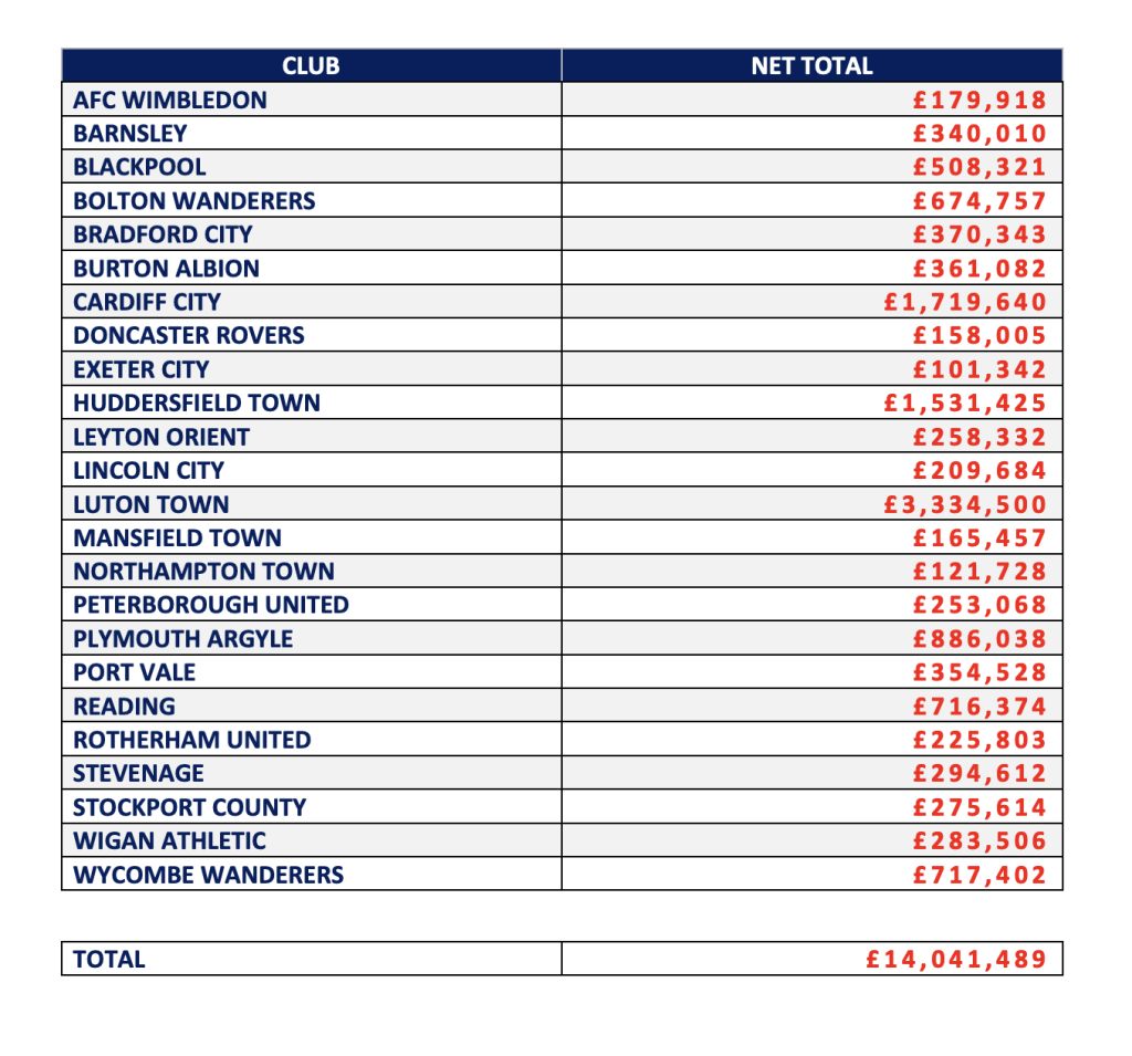 CLUB – NET TOTAL AFC WIMBLEDON – £179,918 BARNSLEY – £340,010 BLACKPOOL – £508,321 BOLTON WANDERERS – £674,757 BRADFORD CITY – £370,343 BURTON ALBION – £361,082 CARDIFF CITY – £1,719,640 DONCASTER ROVERS – £158,005 EXETER CITY – £101,342 HUDDERSFIELD TOWN – £1,531,425 LEYTON ORIENT – £258,332 LINCOLN CITY – £209,684 LUTON TOWN – £3,334,500 MANSFIELD TOWN – £165,457 NORTHAMPTON TOWN – £121,728 PETERBOROUGH UNITED – £253,068 PLYMOUTH ARGYLE – £886,038 PORT VALE – £354,528 READING – £716,374 ROTHERHAM UNITED – £225,803 STEVENAGE – £294,612 STOCKPORT COUNTY – £275,614 WIGAN ATHLETIC – £283,506 WYCOMBE WANDERERS – £717,402 TOTAL – £14,041,489