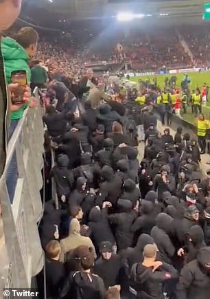 His actions did stop a large group of the thugs seen wearing balaclavas making their way up the steps. The players were so worried by the violence that they stopped celebrating and ran to help.
