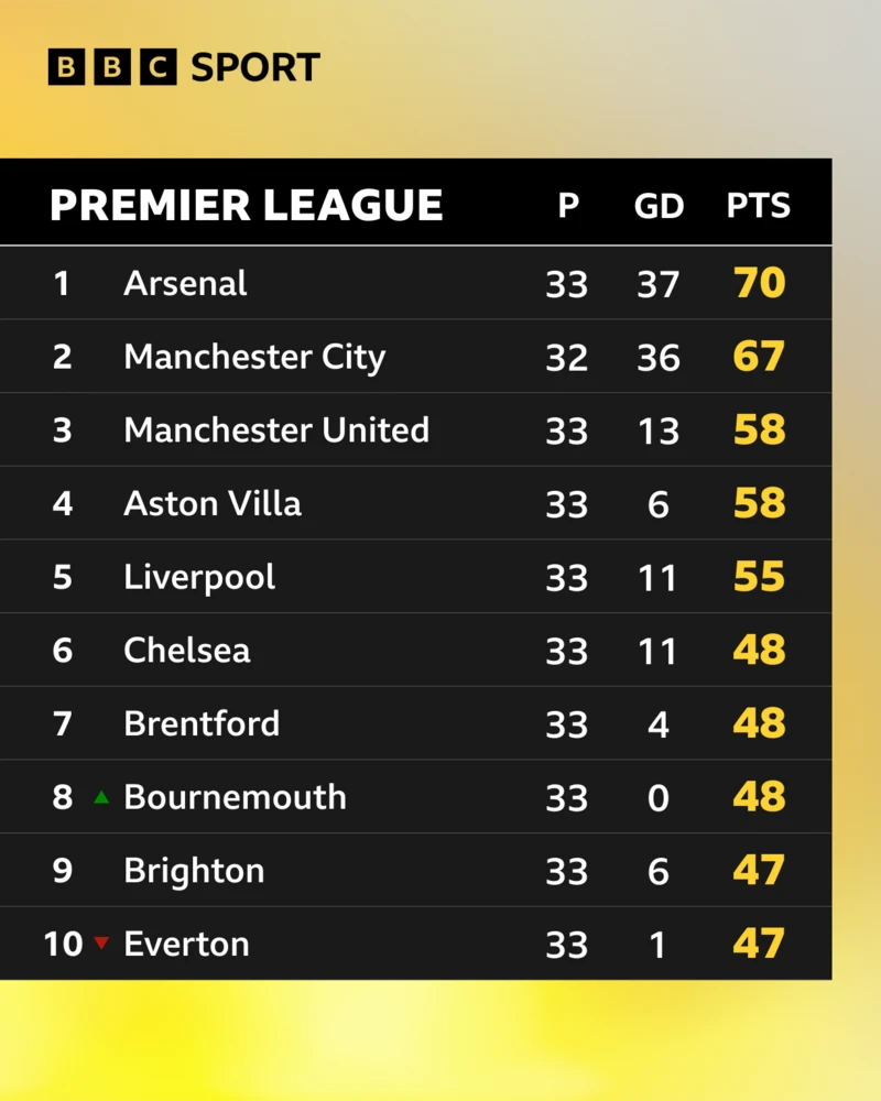 The result sees 5th place Liverpool sit on 55 points from 33 games played, seven points clear of 6th place Chelsea, who have 48 points from 33 games played. Everton are 10th with 47 points from 333 games.