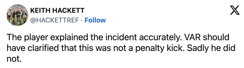 “I think it’s a really poor decision. VAR had a chance to undo it. They tried to say he was leaning to the ball. Surely you’re allowed to lean with your hands by your sides.