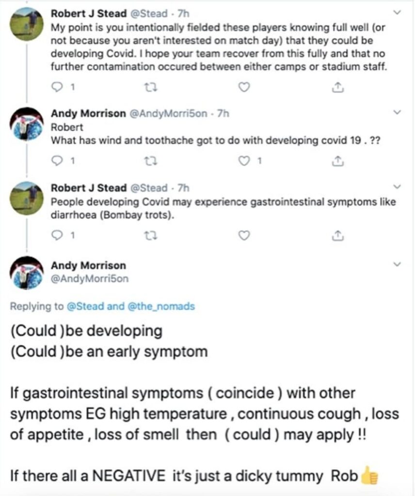 ‘Morrison clarified this in a tweet on his own personal Twitter account, indicating that a number of players had suffered from isolated pre-match upset stomach and headaches likely down to nerves due to being thrust into the starting lineup.’