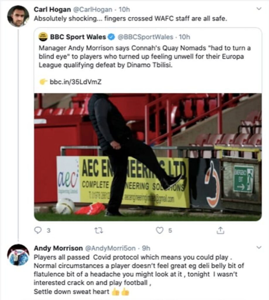 Connah’s Quay Nomads, who play in the Cymru Premier, have denied breaching coronavirus protocol after their manager Andy Morrison claimed they were suffering from stomach ache and toothache.