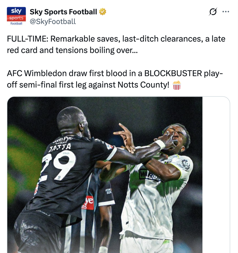 Notts County 0-1 Wimbledon: This playoff semi final 1st leg saw remarkable saves, last-ditch clearances, a late red card, and heated scenes.