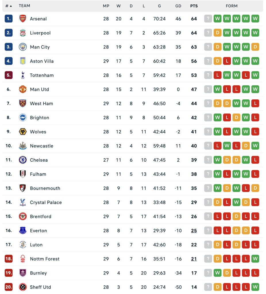 However, as the saying goes, football is an unpredictable sport and despite Man City being the favorites in Premier League betting, anything can occur. This season, it appears that we have a clear top five contenders. Manchester City, Liverpool, and Arsenal are poised to compete for the title, while the battle for fourth place seems to be a direct showdown between Aston Villa and Tottenham Hotspur. Although Manchester United is making efforts to break into the top six, they currently trail Aston Villa by nine points in fourth position.