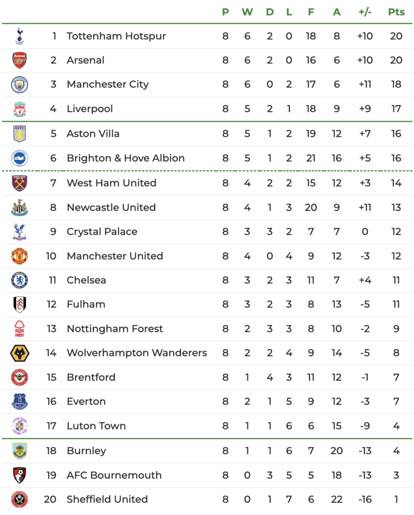 Tottenham are the ones leading the way at top of the standings, on goals scored, having also picked up six wins and drawn twice so far, with Ange Postecoglou impressing since arriving at the club, who beat Luton 1-0 to stay unbeaten.