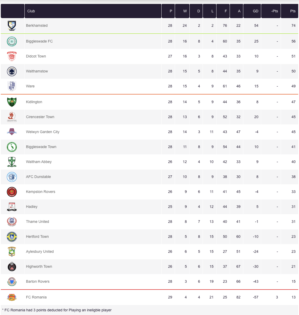 Southern League Division One Central club FC Romania have been deducted three points – leading to big change in their relegation battle.