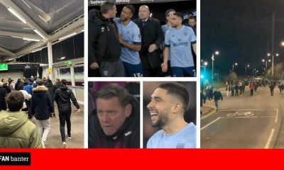 West Ham assistant Kevin Nolan gets held back in his half time row with Neal Maupay; while Brentford fans walk out...