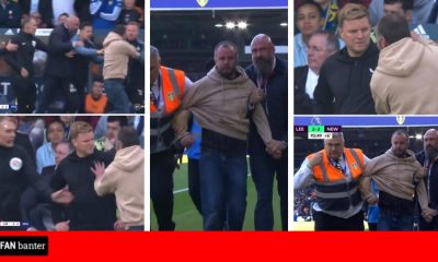 A Leeds fan jumps out of the stands and pushes Newcastle manager Eddie Howe on the touchline before the culprit is...