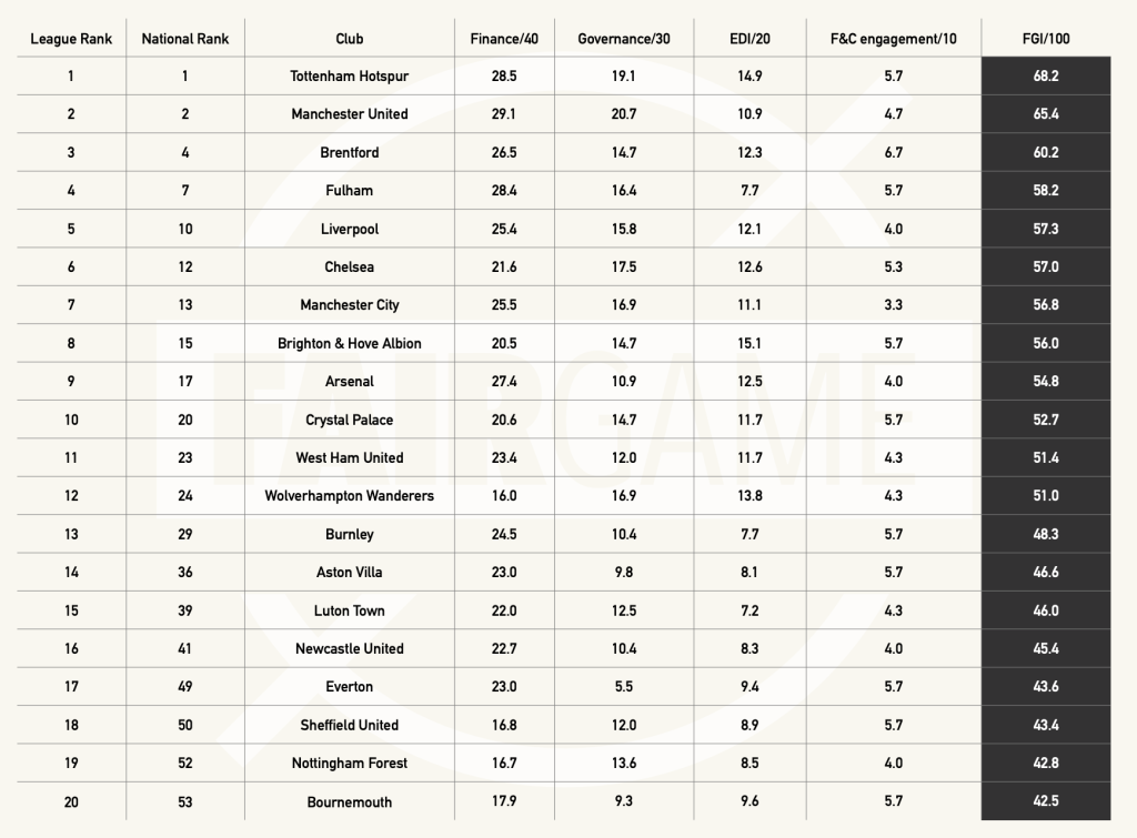 Each club is then scored out of 100, with 40 points coming from financial sustainability metrics, 30 coming from governance measures, 20 for equality standards, and 10 for fan engagement. This score provides a comprehensive measure of how well-run a club is, with a detailed report outlining the winners and losers in each division.
