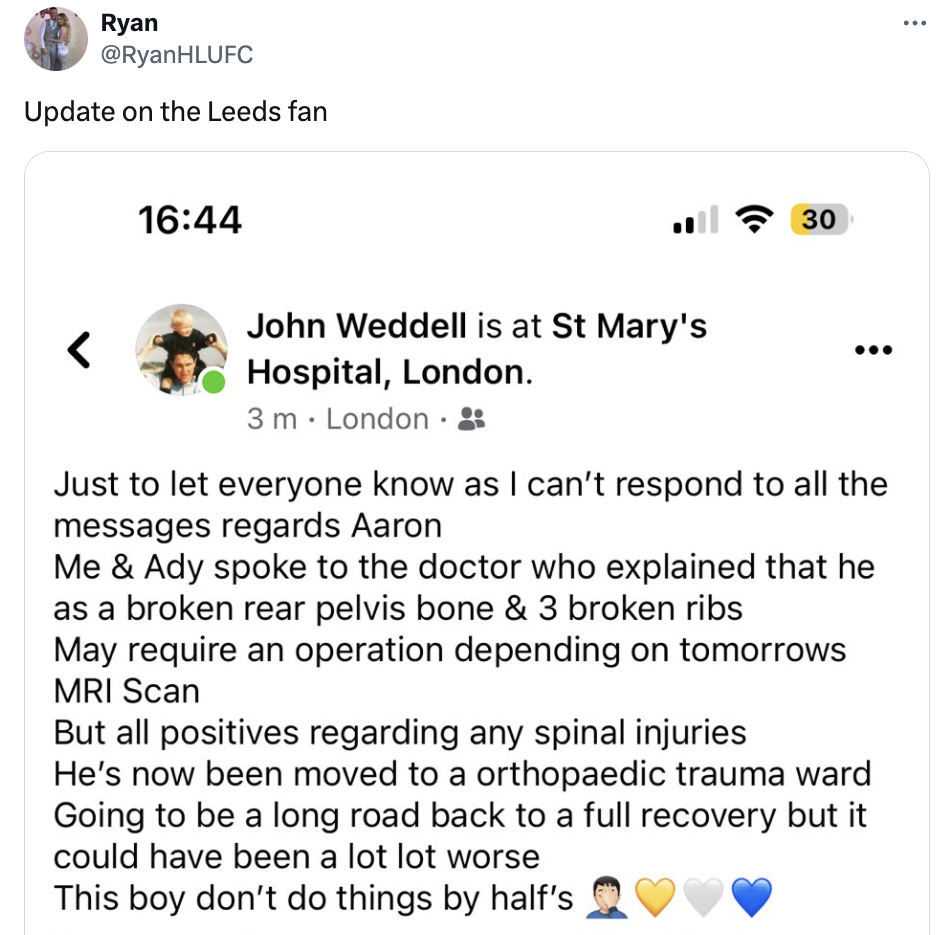 Twitter users reacted to the update given on hospitalised Leeds fan Aaron Cawley who fell from top tier at Chelsea…
